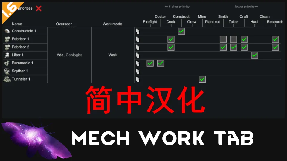 Mech Work Tab(简中汉化) 这个模组添加了一个机械族的工作优先级标签页,类似于原版中殖民者的工作标签页。 MOD中自带的汉化已经有所缺失,所以我制作了这个翻译。 @摄魂狼 如果你将来再次递交了一份完整的翻译给作者Space Moth,请留言告知我,我将删除这个翻译模组。