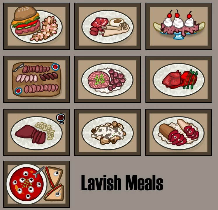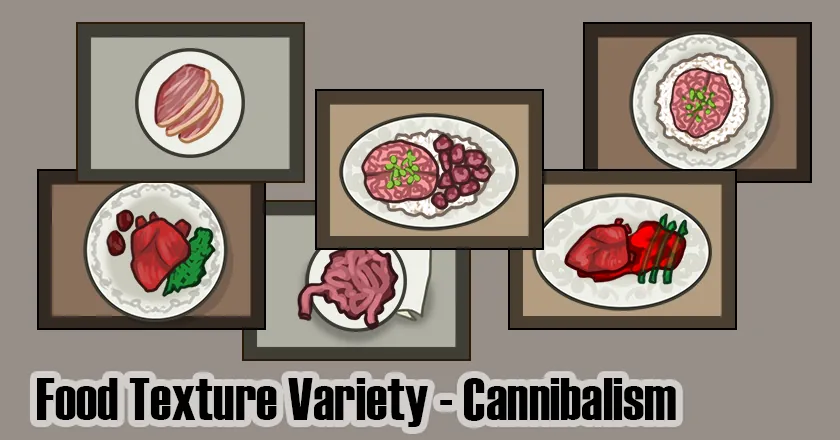 This mod uses alternate textures for meals, with only one recipe! Adds cannibal specific recipes to copy the base game meals, except using the variety graphics class from Food Texture Variety Core.
