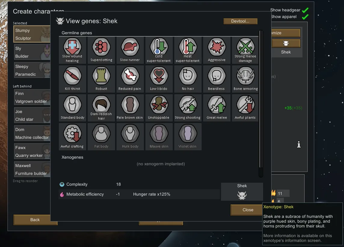 Adds the shek as a xenotype. They spawn in their own faction, with a tribal option for those low-tech playthroughs. Outside of that they have a small chance of spawning in outlander factions. They also carry over the custom shek names from the legacy mod.