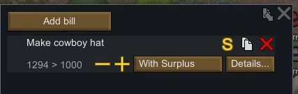 - And why not, there's also do bill "With Surplus" : Does the bill only if you have extra ingredients, more than X. Includes all resources that are checked to use for the bill. (Doesn't work on multi-ingredient bills, since, y'know, that's another layer of complication)