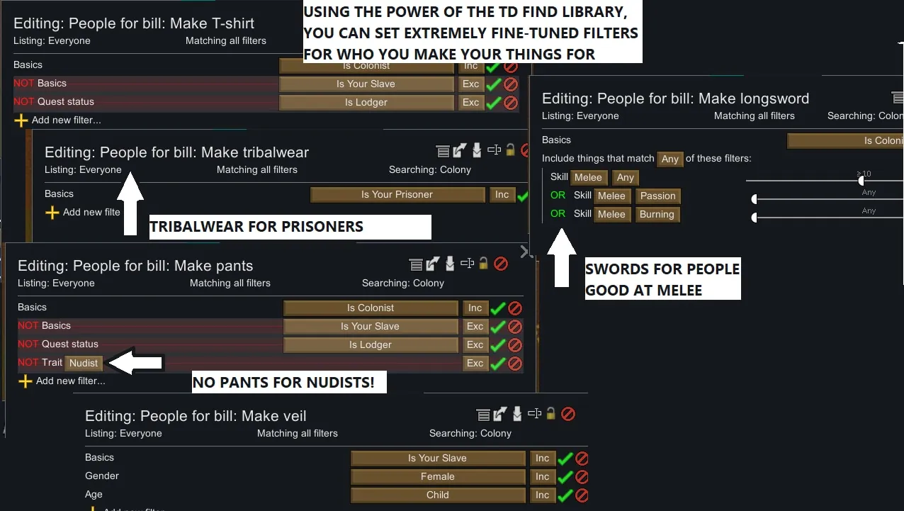 [b]Highly-customizable target counts[/b] thanks to the TD Find Lib. You can edit who counts as a person: Check out the preview images. e.g. you can not only set a bill to craft tribalwear for slaves only, you can set the bill to craft weapons only for your people with the appropriate skill!