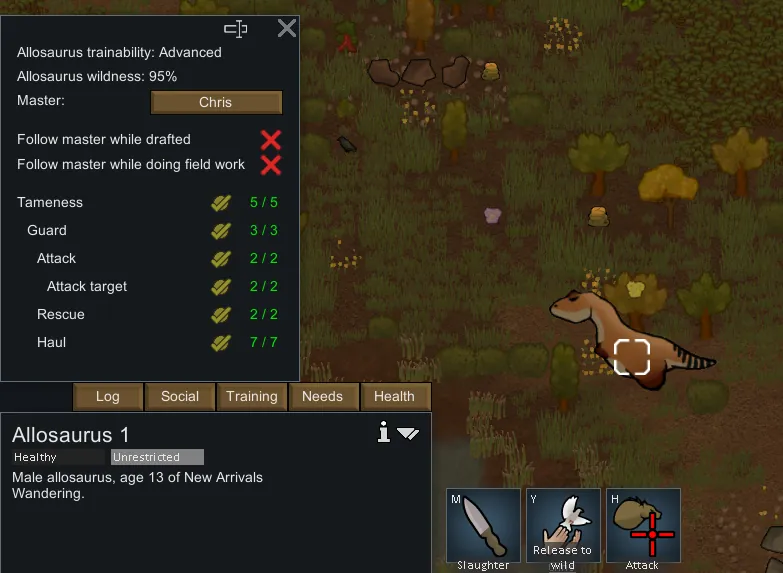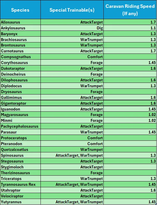Howdy! This is a somewhat simple patch for the Dinosauria mod by Spincrus. It gives all dinos a special training attribute, and allows many to be ridden as part of a caravan.