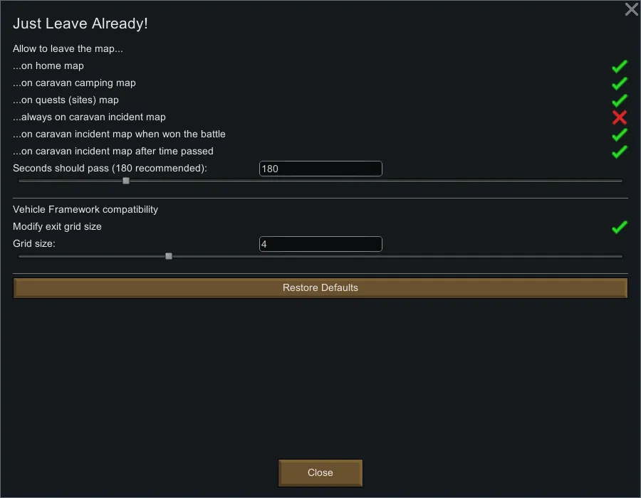 - allows to leave caravan incidents (ambush) with different conditions (default - if battle won or if 3 minutes passed).