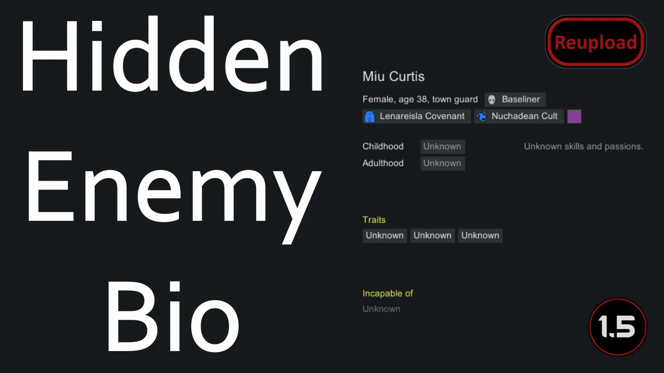 Hidden Enemy Bio hides parts of the bio tab depending on the resistance of the character. Unwaveringly loyal pawns will never speak a word about themselves to you, but others will slowly reveal their character as their resistance decreases.