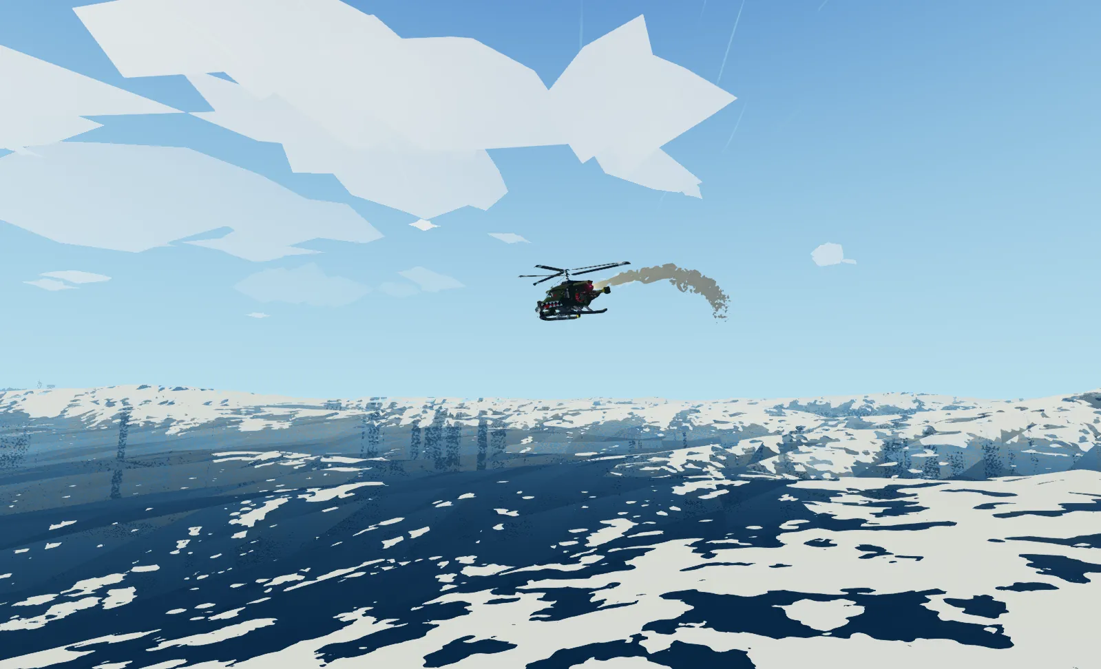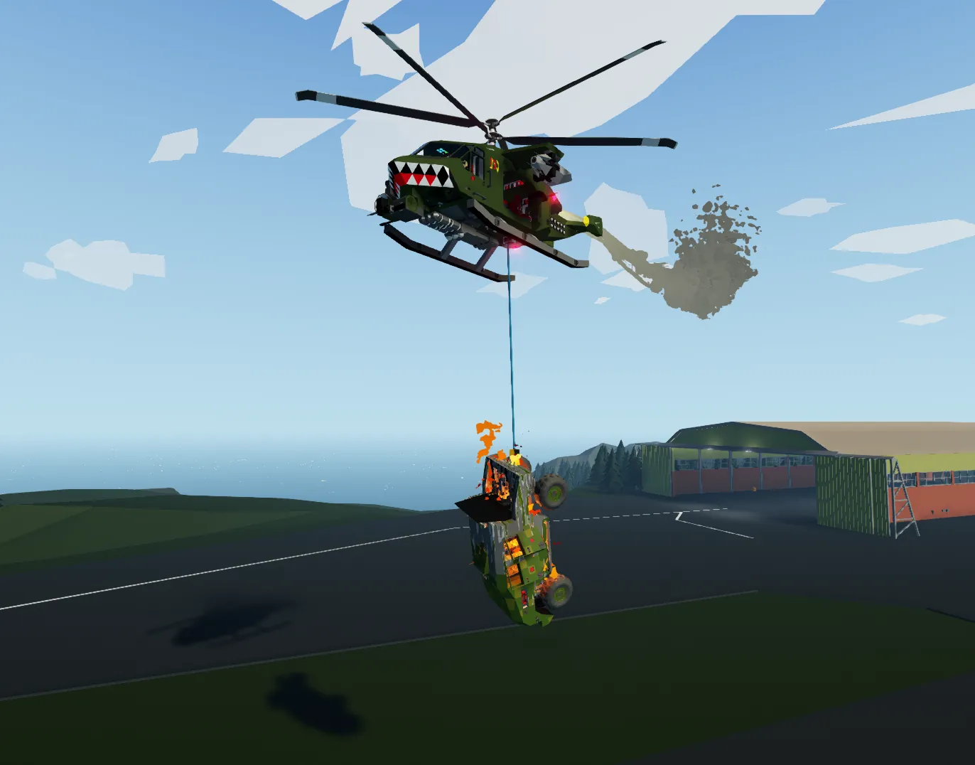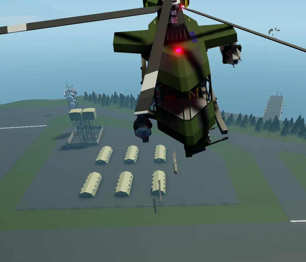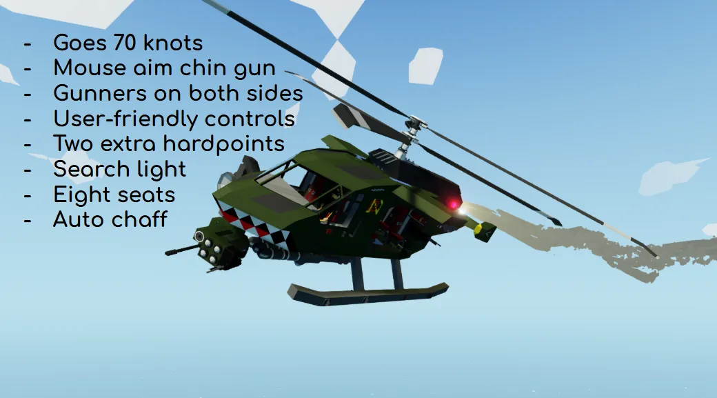 The NC AC-UH-15 helicopter is a small insertion helicopter designed to carry a team of soldiers into combat, and provide limited air support if needed. It has a total of eight seats, and an additional two hardpoints where weapons, bombs, missiles, or other hardpoint mounted stuff can be attached.