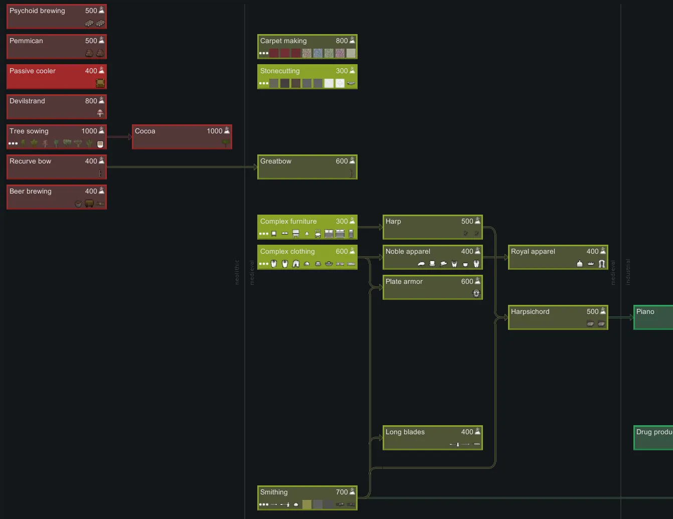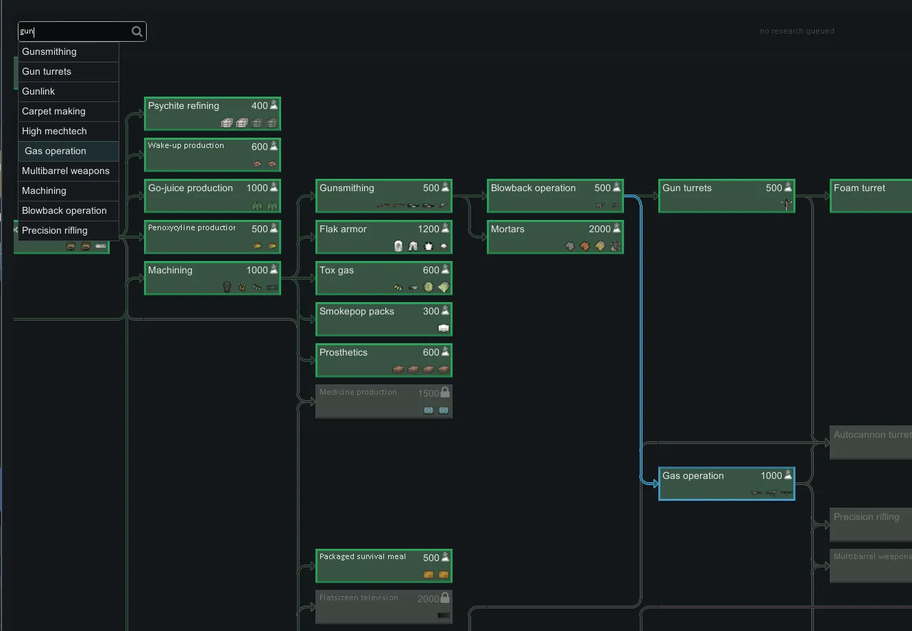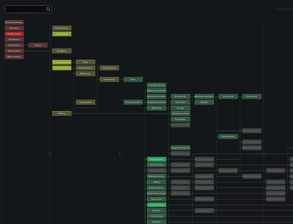 - automatically generated to maximize readability*. - shows research projects, buildings, plants and recipes unlocked by each research project. - projects can be queued, and colonists will automatically start the next project when the current research project completes. - search functionality to quickly find research projects.