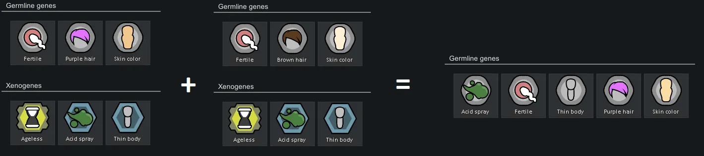 Furthermore, this mod changes the likelihood of inheriting archite genes. In vanilla, inheriting archite genes is impossible. Archite gene inheritance probability is calculated using this formula, one per parent additively: 0.5 * (1.0 / (gene_complexity + 1.0)). That means that one parent with the Ageless gene, which has a complexity of 3, would have a 12.5% chance to pass it on - if both parents have it, there's a 25% chance to pass it on.