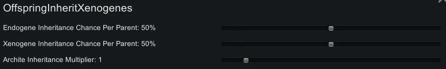 Plus, all of these values are configurable! So if you want xenogens to be passed on, but at a lower chance, or you want to guarantee or entirely disable archite inheritance, or any other tweaks, just check the mod options!