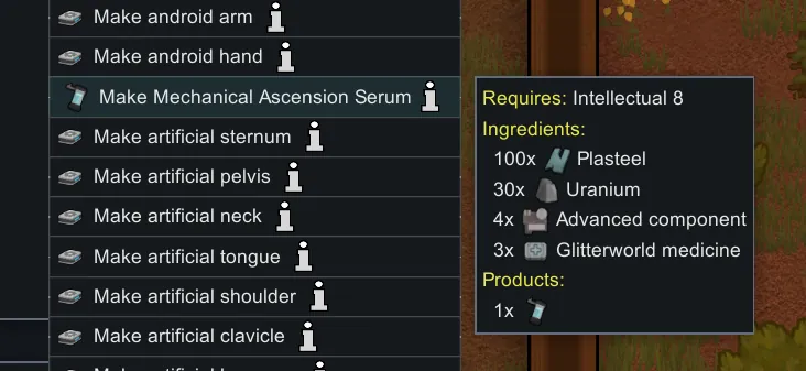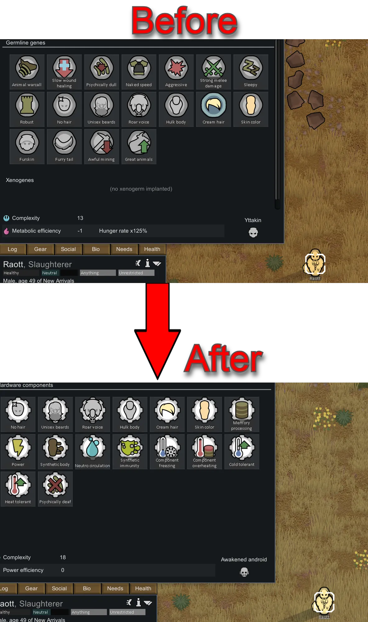 [*] The new item, the "Mechanical Ascension Serum", changes a pawn's xenotype to that of an Awakened Android. They will now have the same needs as that of an android and no more biological needs, such as food or sleep.