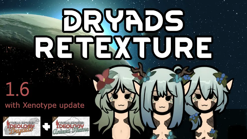 If you want Vanilla Expanded Dryad retexture: [url=https://steamcommunity.com/workshop/filedetails/?id=2720631512]Vanilla Ideology Expanded - Dryads[/url] is needed