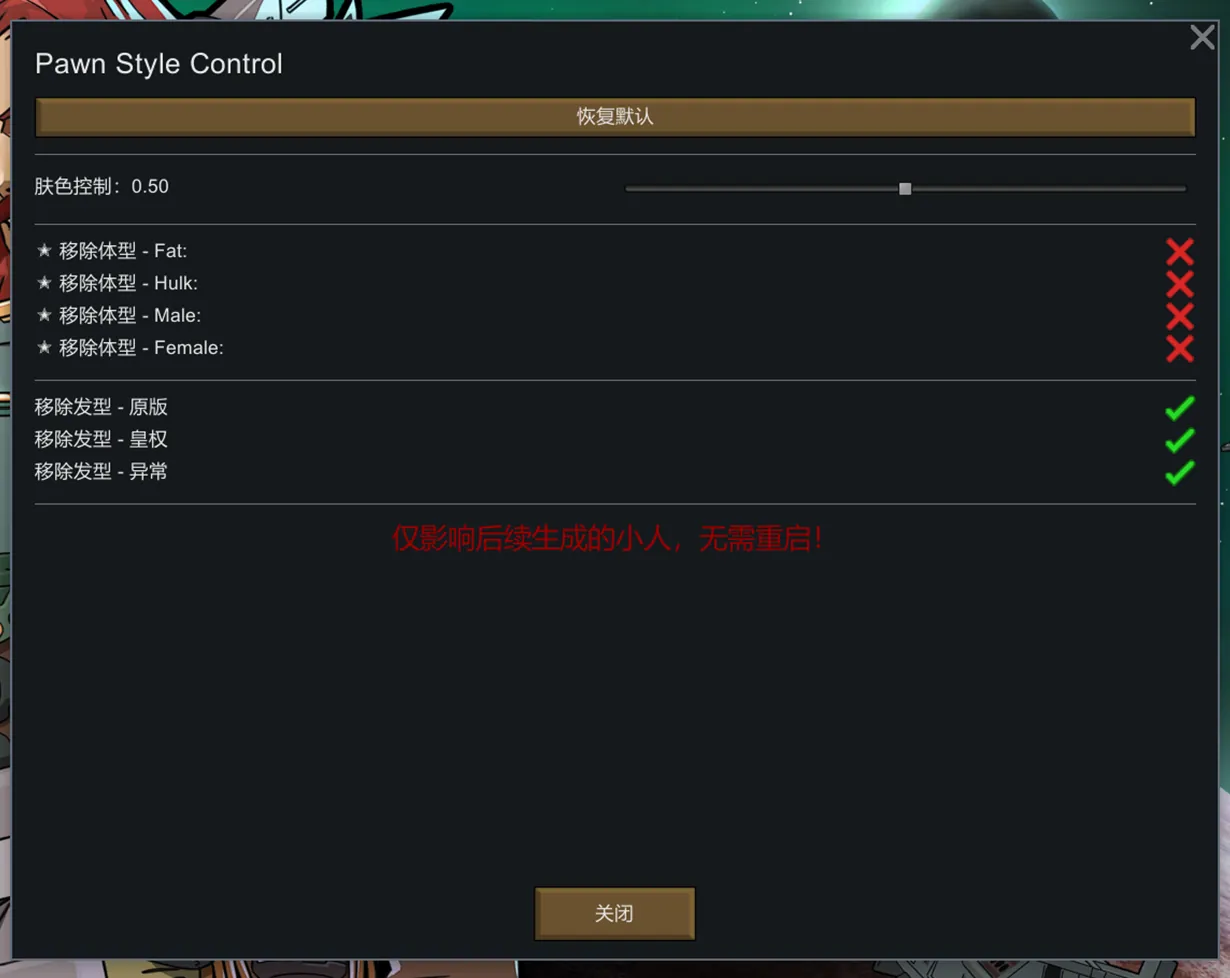 控制普通棋子肤色和体型,移除原版和DLC中的发型;