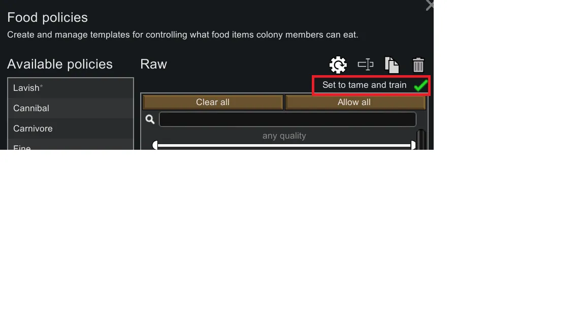 Allow you to set food restriction for animals. Allow you to set a specific for training and taming animals.