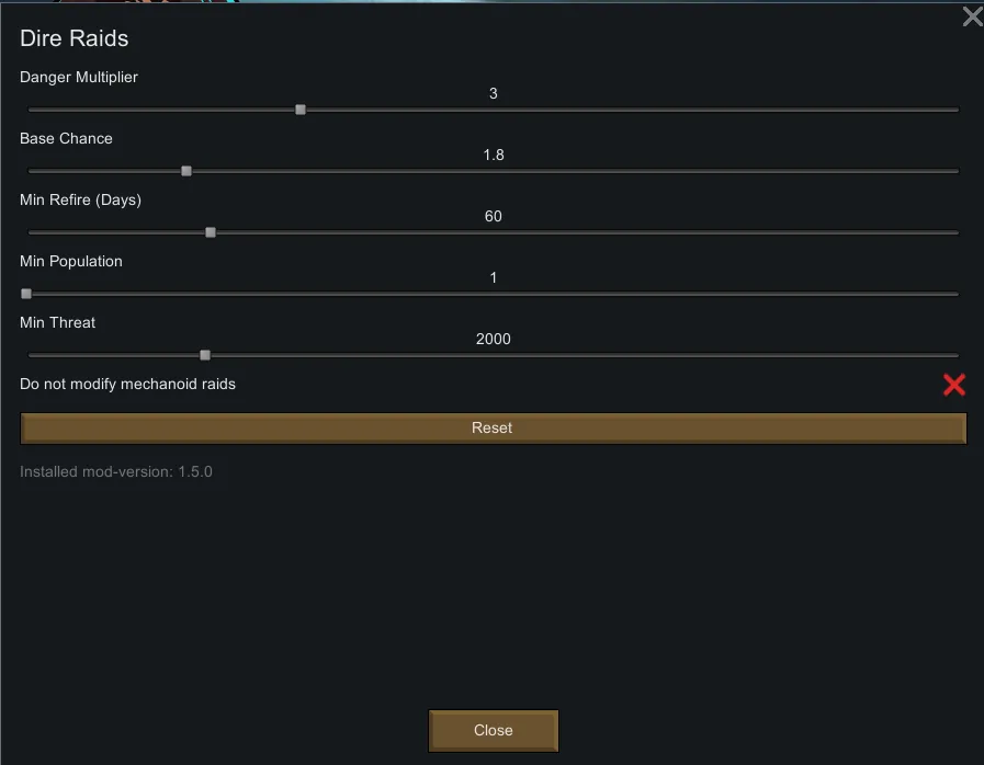 By default the Dire Raid event is rare and can't occur back-to-back. Dire raids can't occur until your base is fairly developed, so no day 20 death balls. The event is limited to augmenting Raid events, not any other events (no Dire Infestations). If any new raids are introduced by other mods they can also become Dire Raid variants.