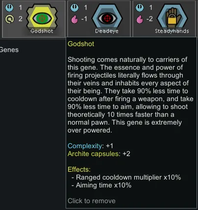 In a newer update, I added the Godshot gene. It costs 2 archite capsules, and multiplies both ranged cooldown and aiming time by 10%, meaning pawns should theoretically be able to shoot 10 times faster than an identical pawn without the gene.
