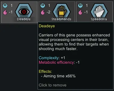Deadeye multiplies your aiming time by 66% by giving your pawns more image processing in their brains, allowing for them to find their targets faster. Costs 1 metabloic efficiency.