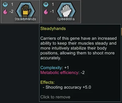 Steady Hands allows your pawns muscles to lock in position when they want as well as improving their ability to balance, allowing them to increase their accuracy when shooting +5, the same as careful shooter without the aiming penalty. Costs 2 metabolic efficiency.