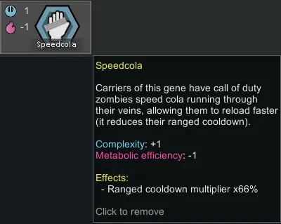 Speedcola makes the body produce the mysterious soda in their bonemarrow, allowing speedcola to flow through their veins, improving reload speed by multiplying ranged cooldown by 66%. Costs 1 metabloic efficiency.