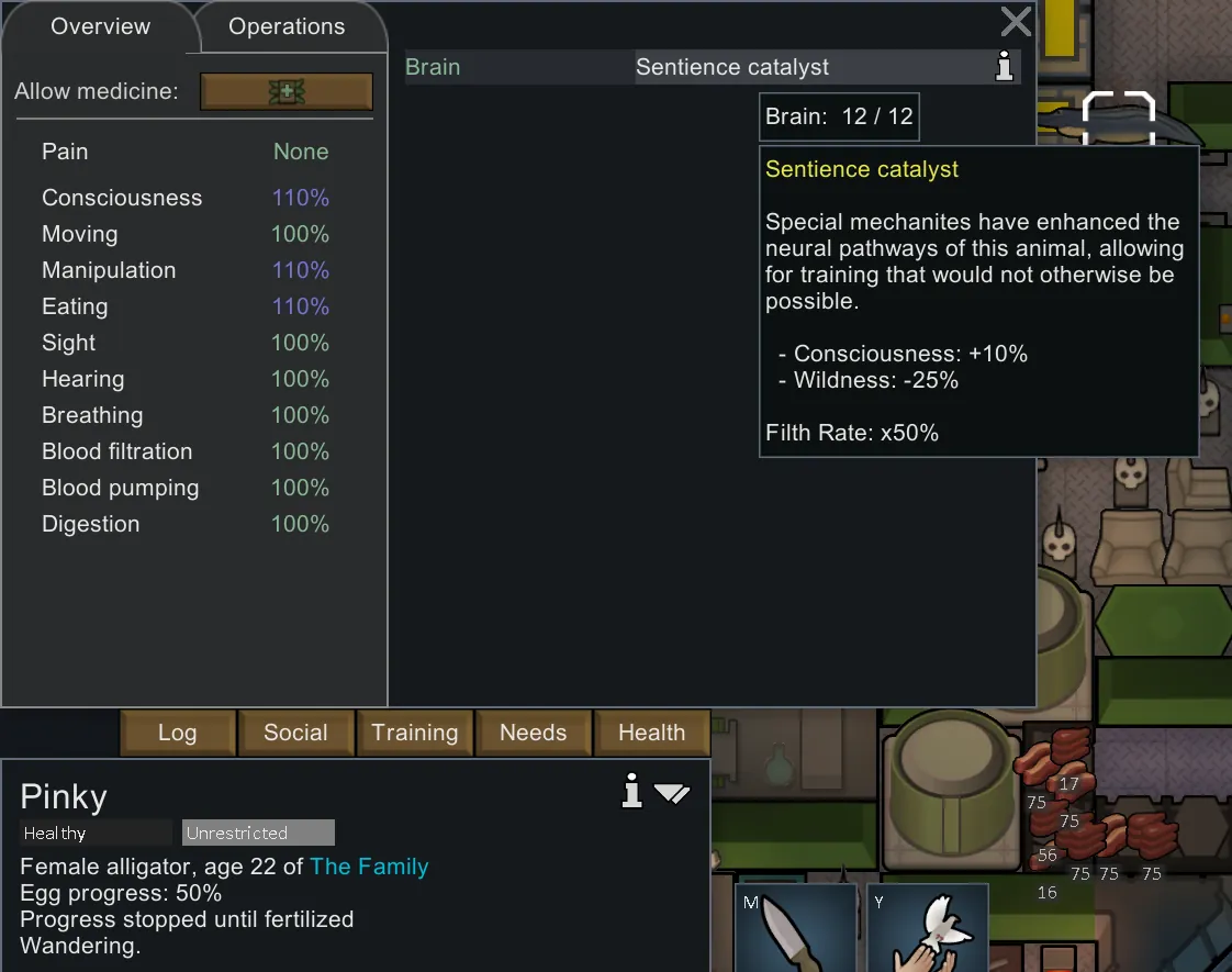 - Percentage-Based Filth Reduction: Reduces the filth generated by animals with the Sentience Catalyst by a percentage. Don't want your prized, super-smart Thrumbo turning your sterile research lab into a barn? Now you can control exactly how clean they are.