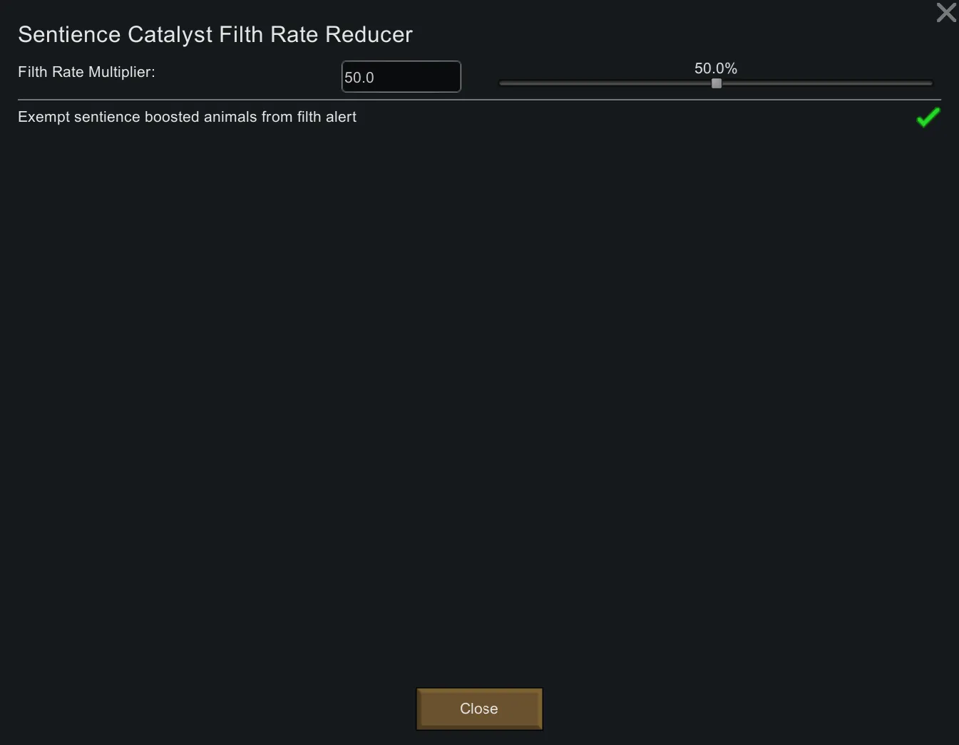 - Compatible with mods that make Sentience Catalyst a leveled/stackable condition. When increasing the severity, the filth rate reduction increases as well.