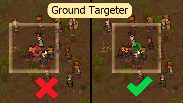 For all weapons, items, or abilities that can target the ground, this mod allows you to preferentially target the ground over other targets by holding down a hotkey. Default hotkey is Left Shift, but this can be changed in Options->Controls->Keyboard configuration.