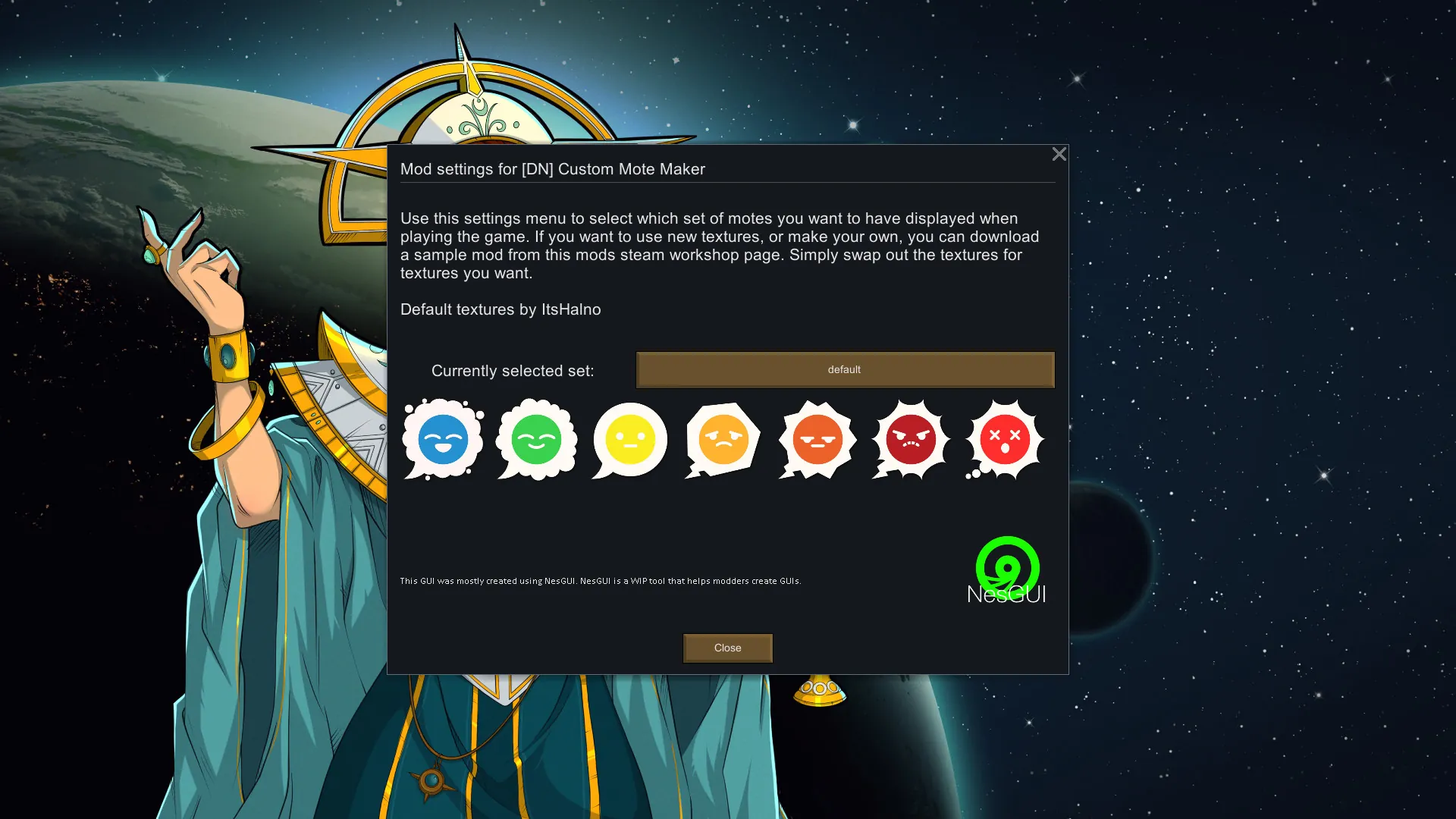 This mod is inspired by [url=https://steamcommunity.com/sharedfiles/filedetails/?id=1668896929]Custom Mote Maker[/url].