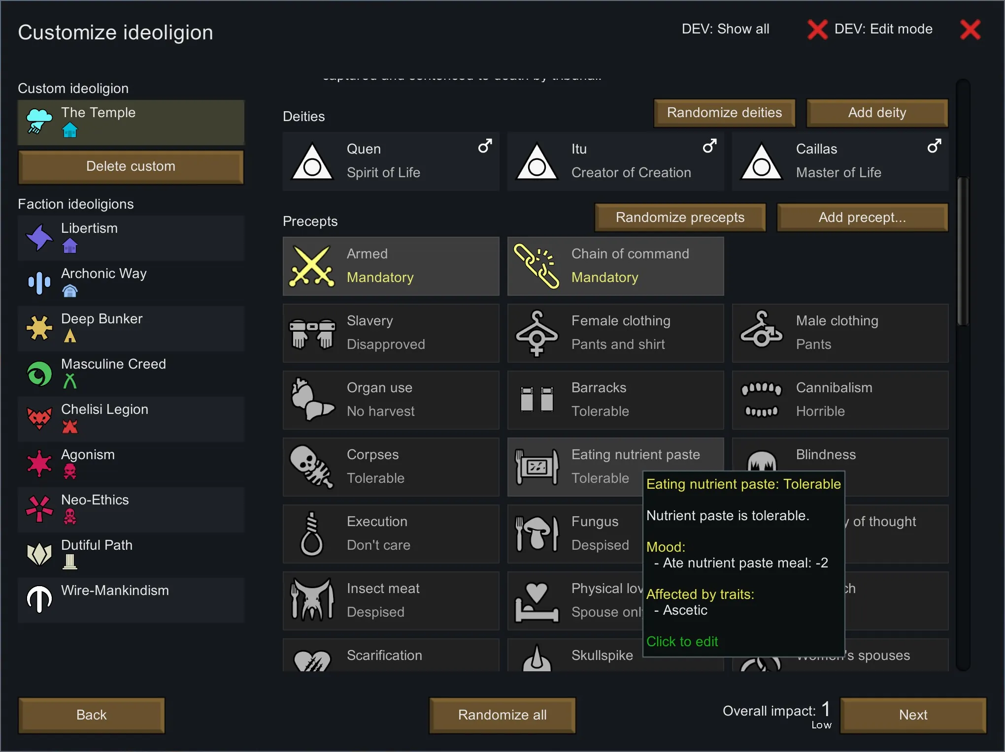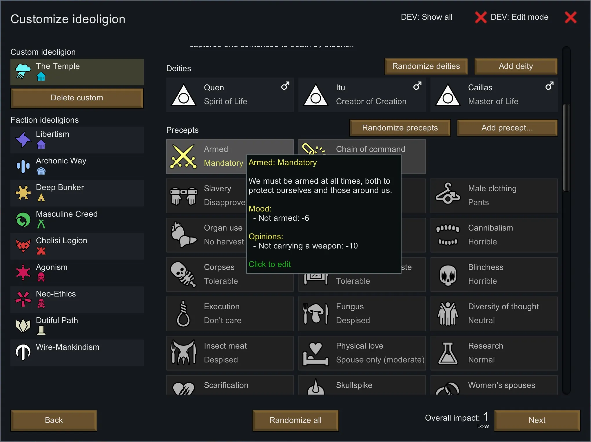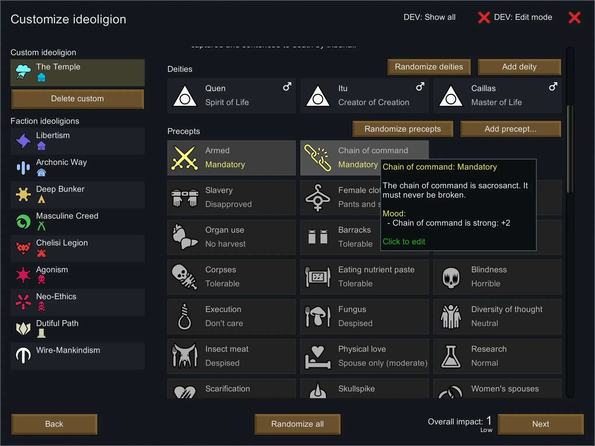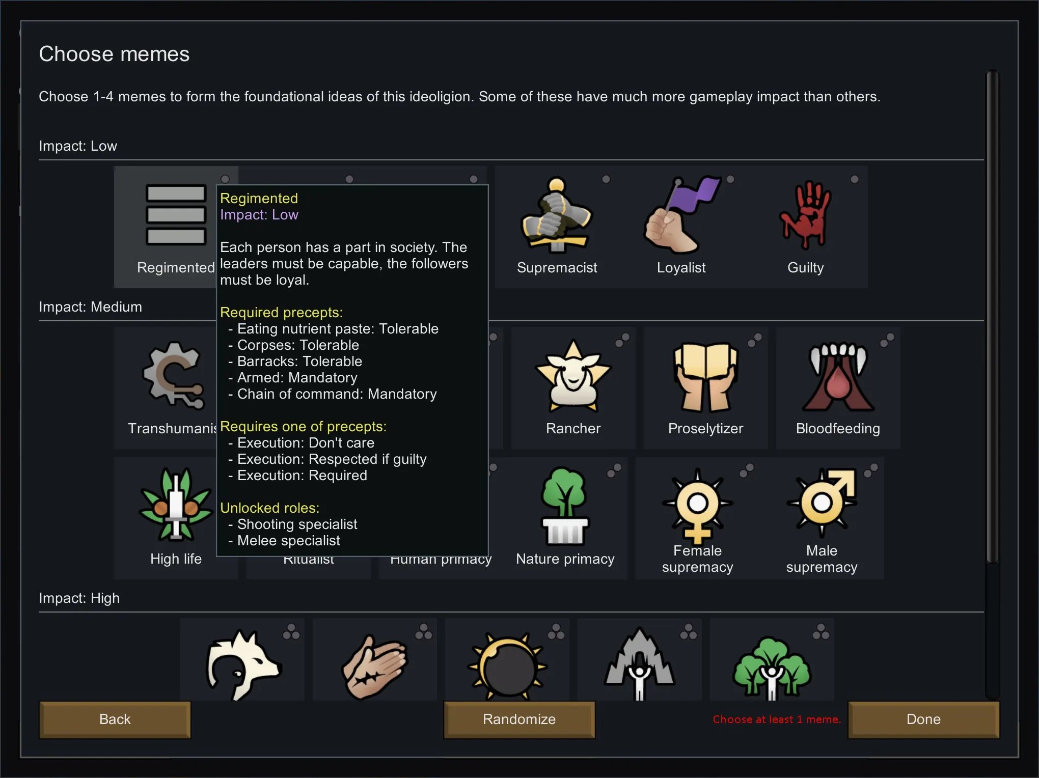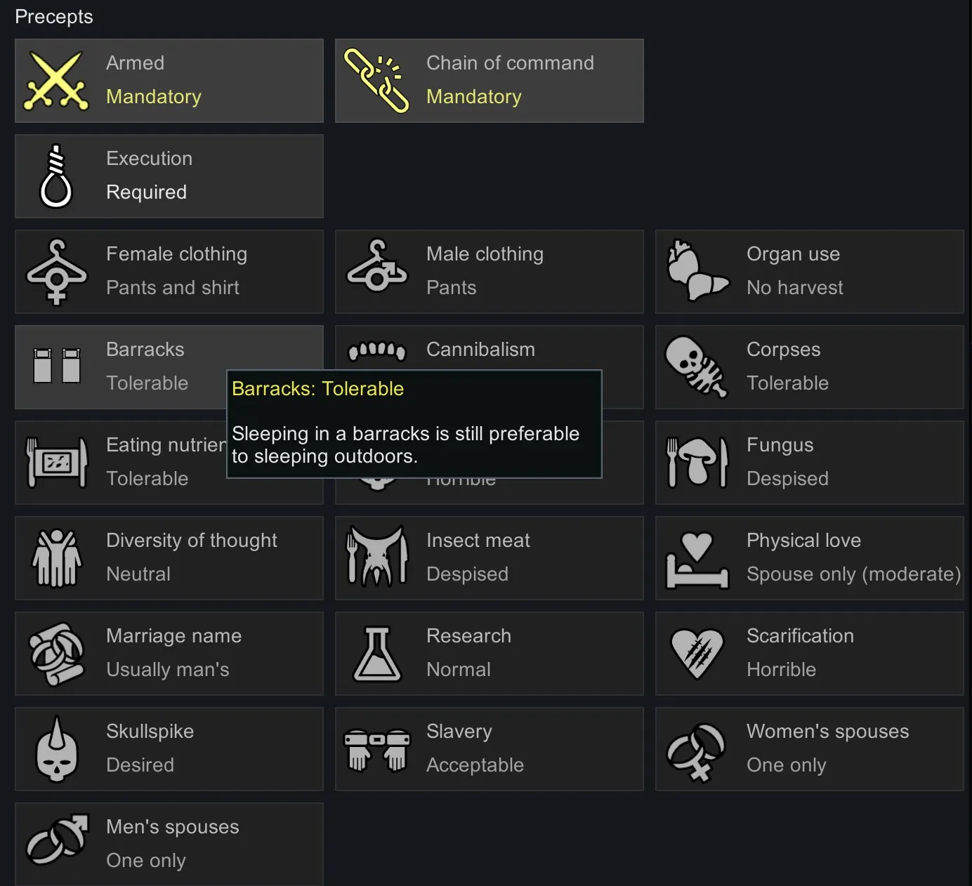 This mod adds a new Ideology meme, Regimented, which allows you to create a regimented society with strict hierarchies and roles. Designed around old militaries and mercenary companies, this meme values discipline and loyalty. All are expected to carry their weight and support their group, and the leaders are expected to be capable and driven.