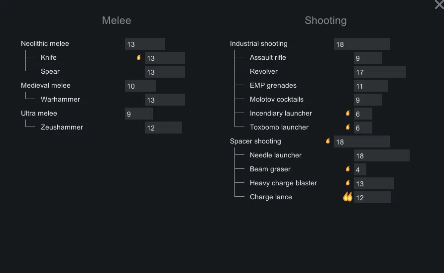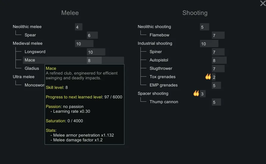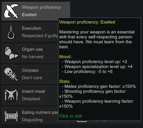 You can have or not have passion for each weapon category, as well as for each weapon. This directly affects the experience gained. Weapon proficiency is generated when a pawn spawns and is based on the pawn's current equipment, ideology, and vanilla combat skills.