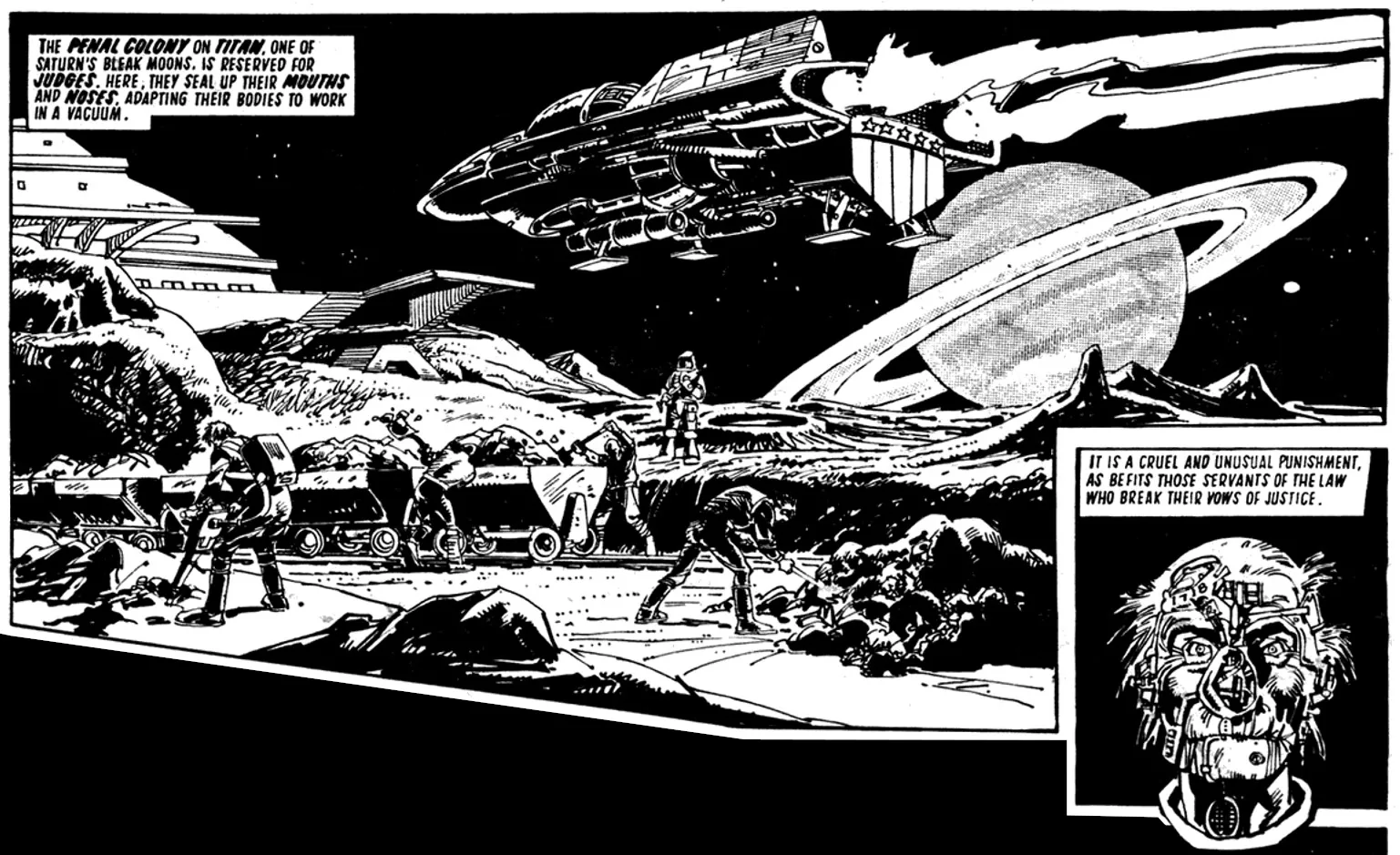 The 'Titan Treatment' was a disfiguring body modification only reserved for the worst of criminals, and Judges who broke their sworn oath to uphold the law. Interred on the penal colony of Titan, prisoners had their mouths and noses sealed, alongside the highly invasive series of implants that would allow them to survive and serve out their sentence on the cold rock without the need of a space suit. These procedures would horribly disfigure the prisoner, serving as additional punishment.