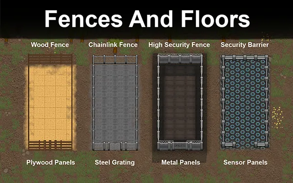 This mod adds 4 new styles of flooring and 4 fences (3 perimeter fences and a smaller defensive barrier). Fences are gathered into their own menu category and research requirements have been applied where appropriate. Plywood paneling and the simple wood fence are available from the beginning and are relatively simple to construct. Upon completing the Machining research requirement access to chainlink fencing, high security fencing, the security barrier, steel grate flooring, and metal panel flooring is made available. The last addition, sensor panel flooring, becomes constructable upon completing a new research project: "Reactive Flooring."
