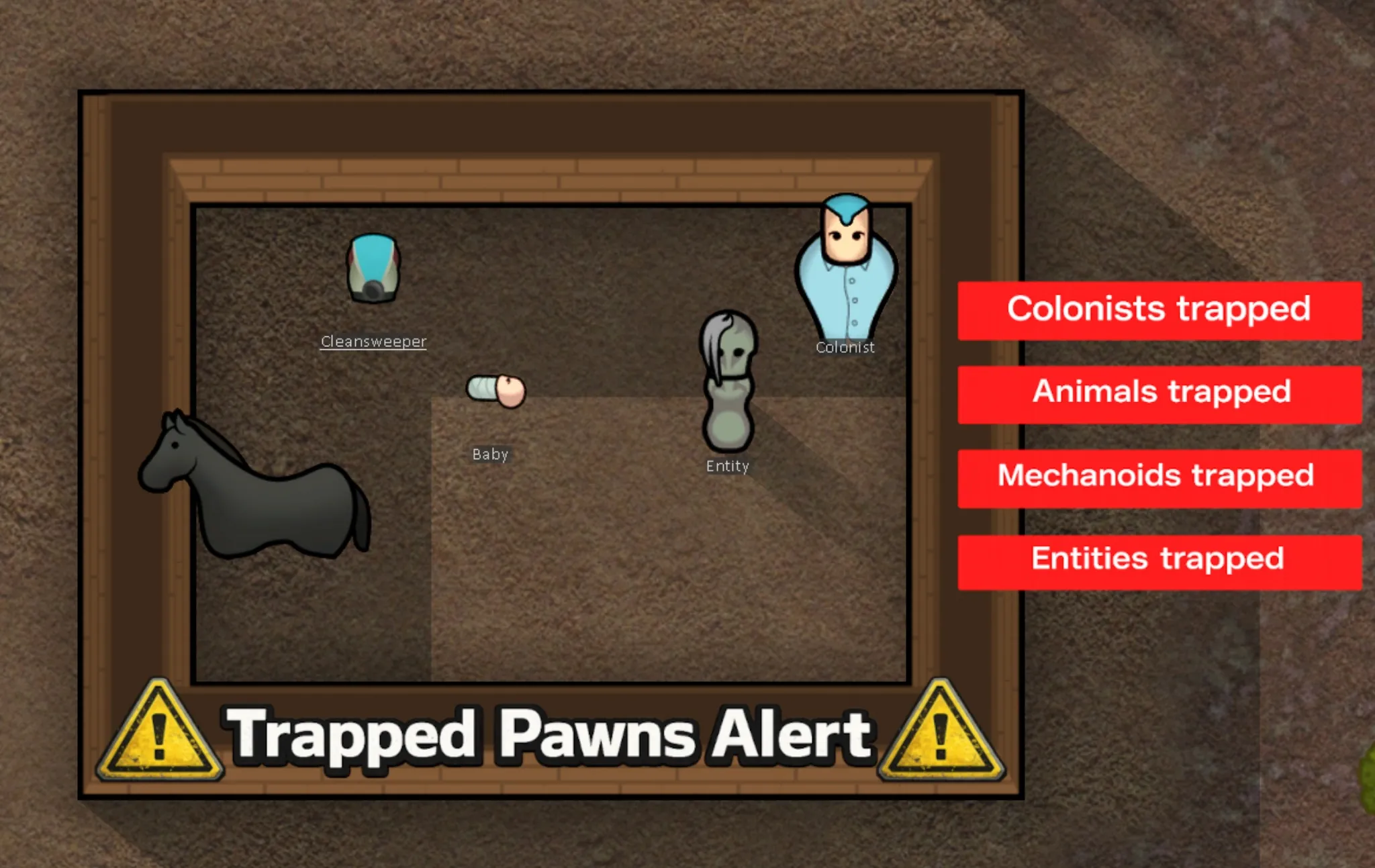 This mod detects when colonists, babies, animals, mechanoids or entities can no longer reach the map edge -- or might be unable to.
