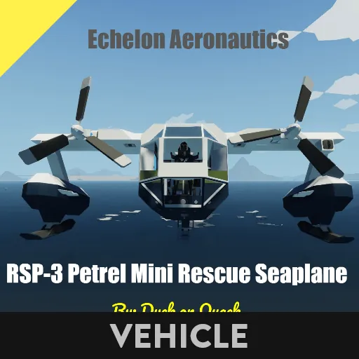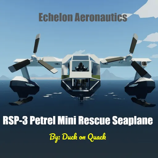 The Echelon Aeronautics RSP-3 Petrel is a miniature rescue seaplane so small that it can fit into a starter base port, eliminating the need for small starter boats. Instead, the Petrel offers an early game eye in the sky, equipped with basic rescue equipment and 4 passenger seats, the Petrel allows for search and rescue anywhere, as not only can the Petrel take off almost vertically from water, but the skis mounted on the bottom allow for land-based operations as well, however land based operations are only recommended for experienced pilots. Don't be fooled by the small size; however, the Petrel can reach impressive speeds and includes advanced navigation and flight systems, including heading and altitude holds. The Petrel is also multiplayer-safe, meaning you can get out of the seat without flying away unless your ping is REALLY bad.