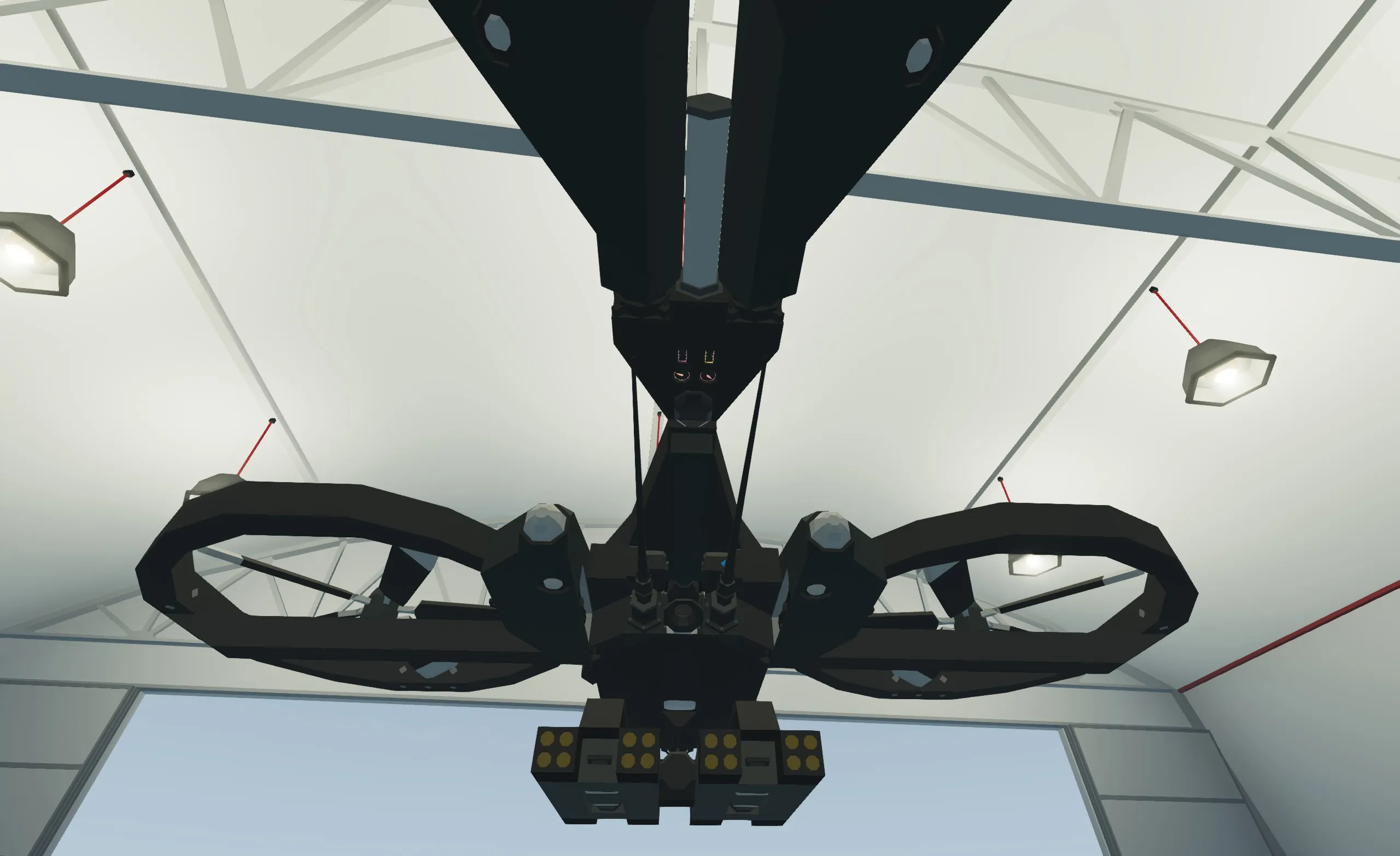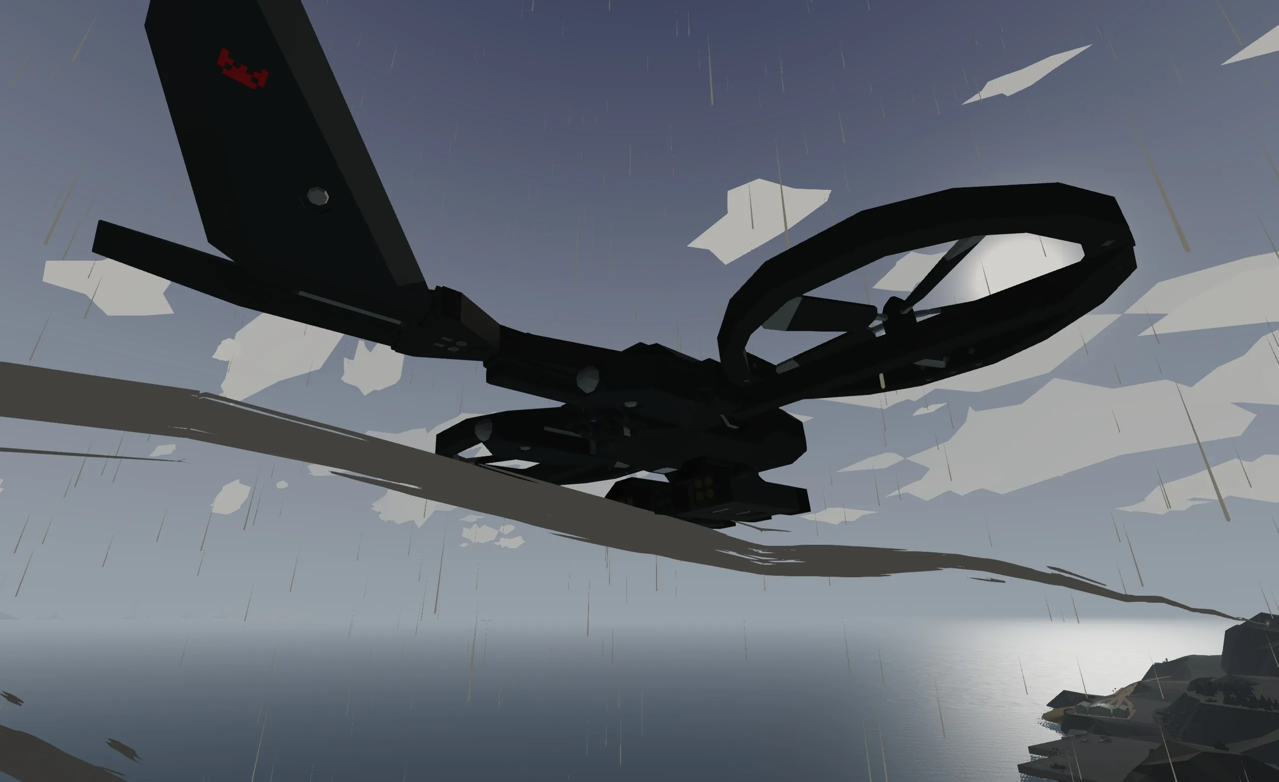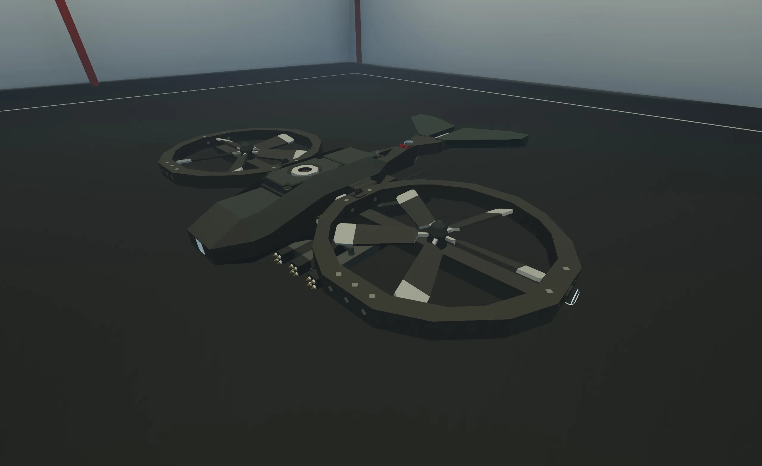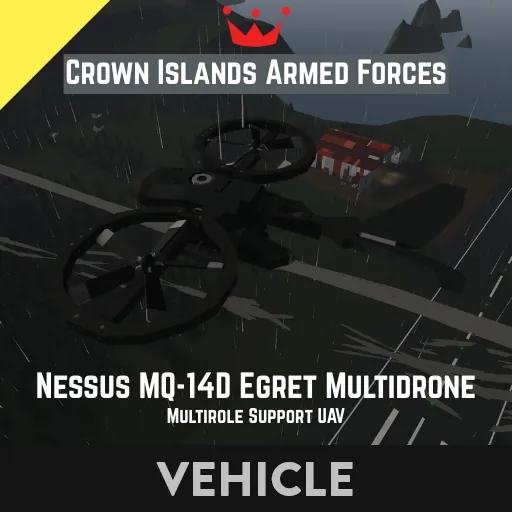 The Nessus MQ-14C Egret MultiDrone is a short range transverse rotor multi-use utility drone built by the fictional Nessus Corporation for the Crown Islands Armed Forces. When operated with from a remote control or intermediate controlling station it can be used to effortlessly carry supplies to the frontline, perform escort duties, or provide security for military instalations