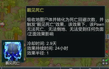 添加一个主动技能“觐见死亡”:施放时吸收地图尸体并转化为死亡回避次数,并触发“觐见死亡”效果,该效果下,该Pawn无法死亡、无法倒地、无法受到任何负面/正面效果影响。无常规获取方式,仅可通过调试模式授予。