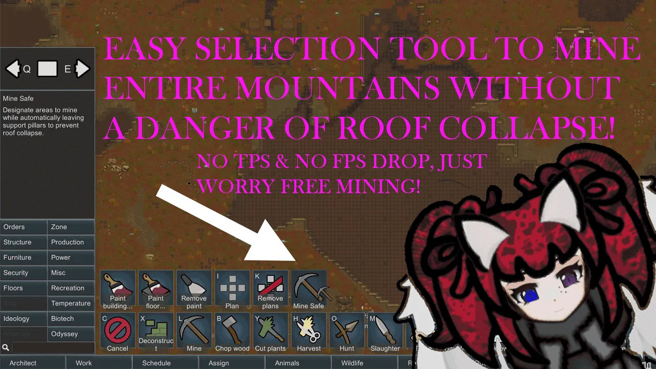 Adds a "Mine Safe" designator in the Orders menu that automatically skips pillar positions to prevent roof collapse. Now you can select an entire mountain or asteroid for mining and not worry about deselecting support areas! I made this because sometimes I want to just mine an entire mountain or asteroid and not worry about removing the roof or it collapsing and murdersmooshing me.