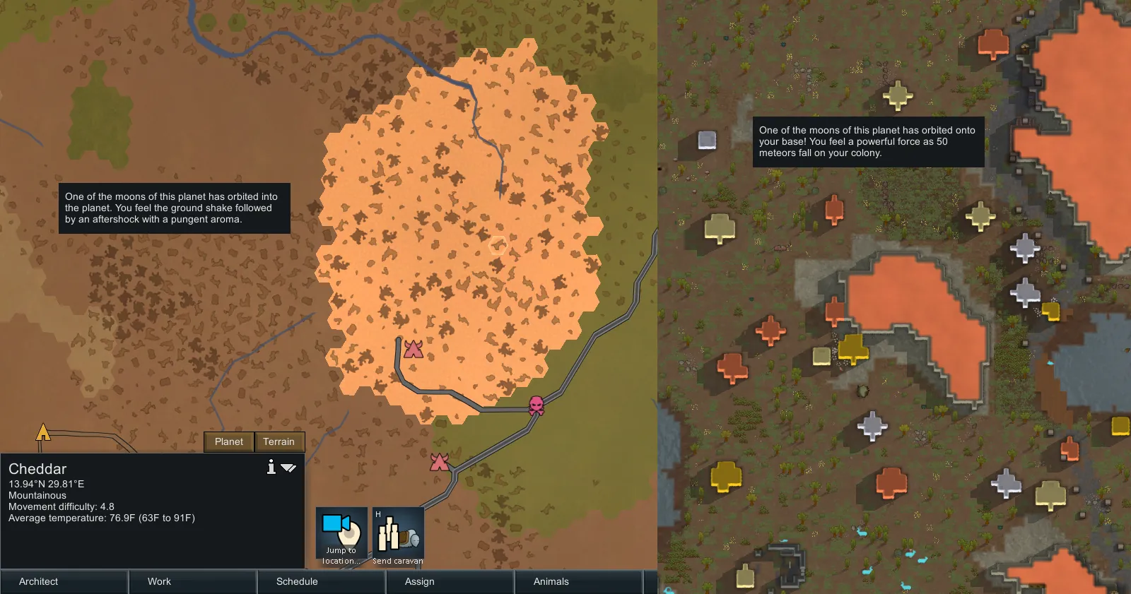 The moons. Great big rocks in the sky. Well some of them at least. You ever look up at one of this Rimworlds moons a notice a yellow hue? Why is that? Furthermore why are some parts of this planet covered in cheese?