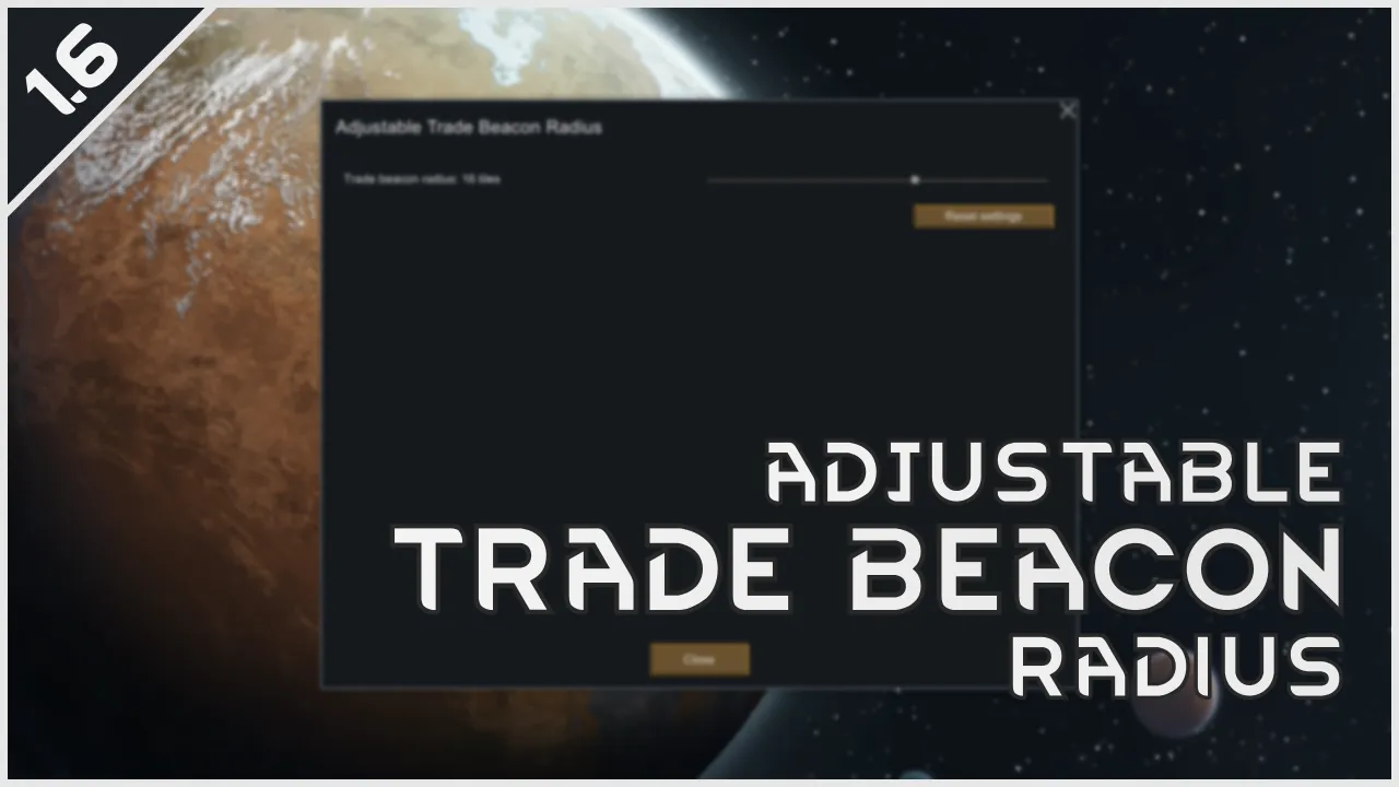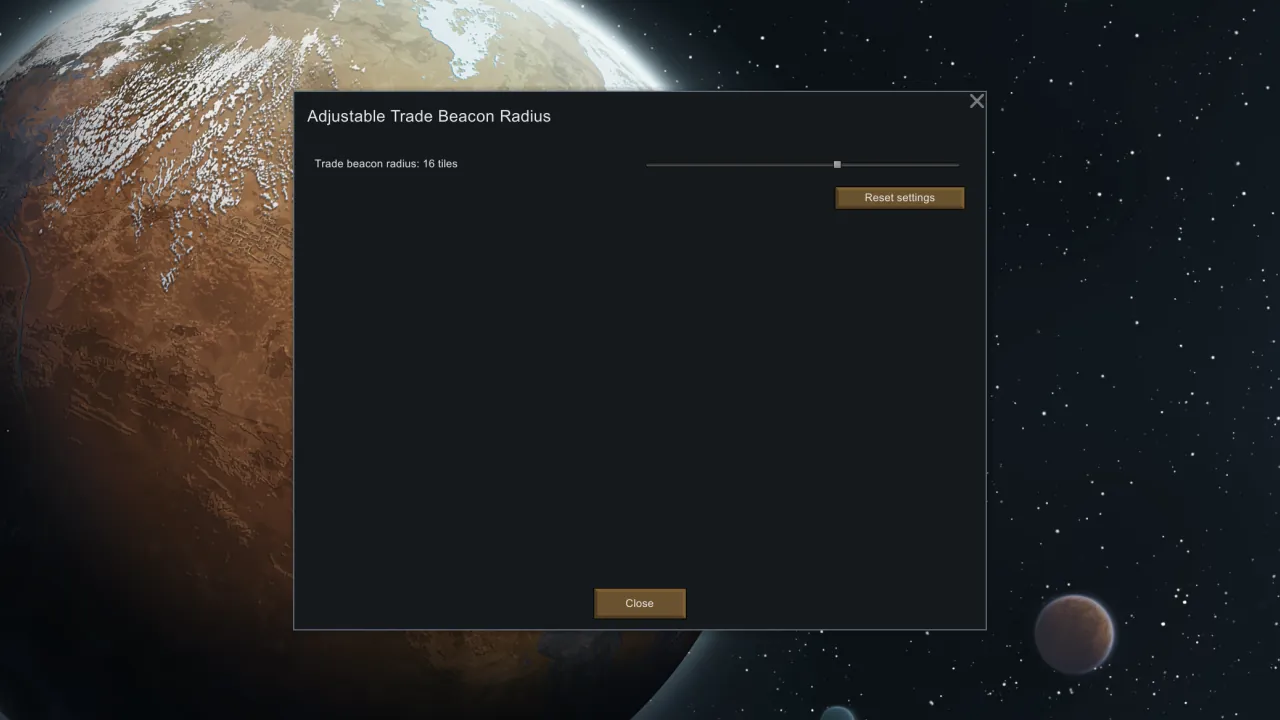 Not much else other than what the title says, really. Inside the mod settings is a slider that allows you to adjust the range on orbital trade beacons, anywhere between a miserly 2 tiles to a sizeable 25. Walls and doors also no longer block a trade beacon's area of influence.