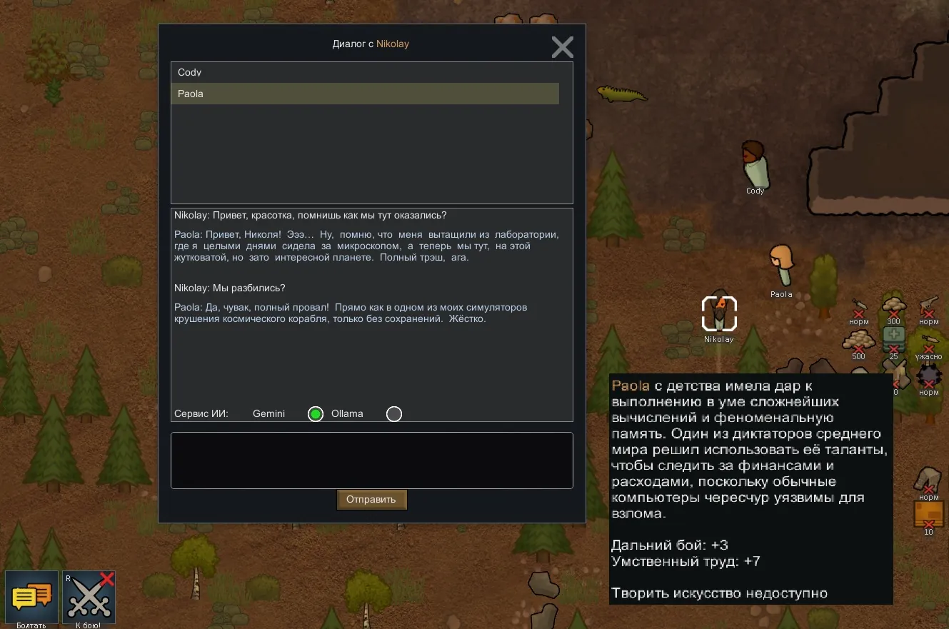 УРА! ВСЕ! Запускаем VPN + Rimworld и играем (можно и без VPN, тогда ответы будут хуже, от локального сервера Ollama). При выборе пешки теперь появилась новая кнопка "Говорить". Открывается список ваших колонистов, выбираем кому адресуем сообщение.