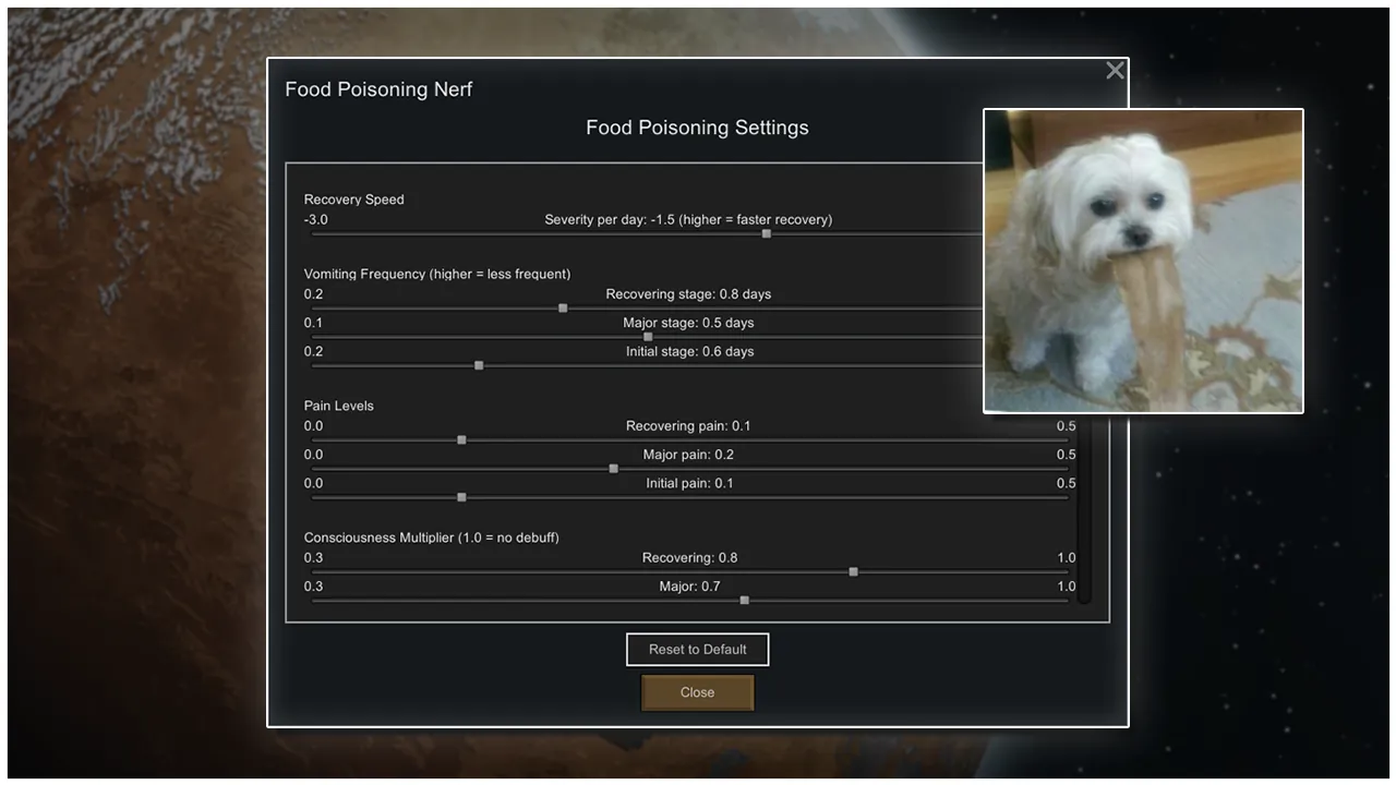 Makes food poisoning adjustable default settings nerf food poisoning a bit to make it less painful to play with [img]https://i.imgur.com/HTB5efh.png[/img]