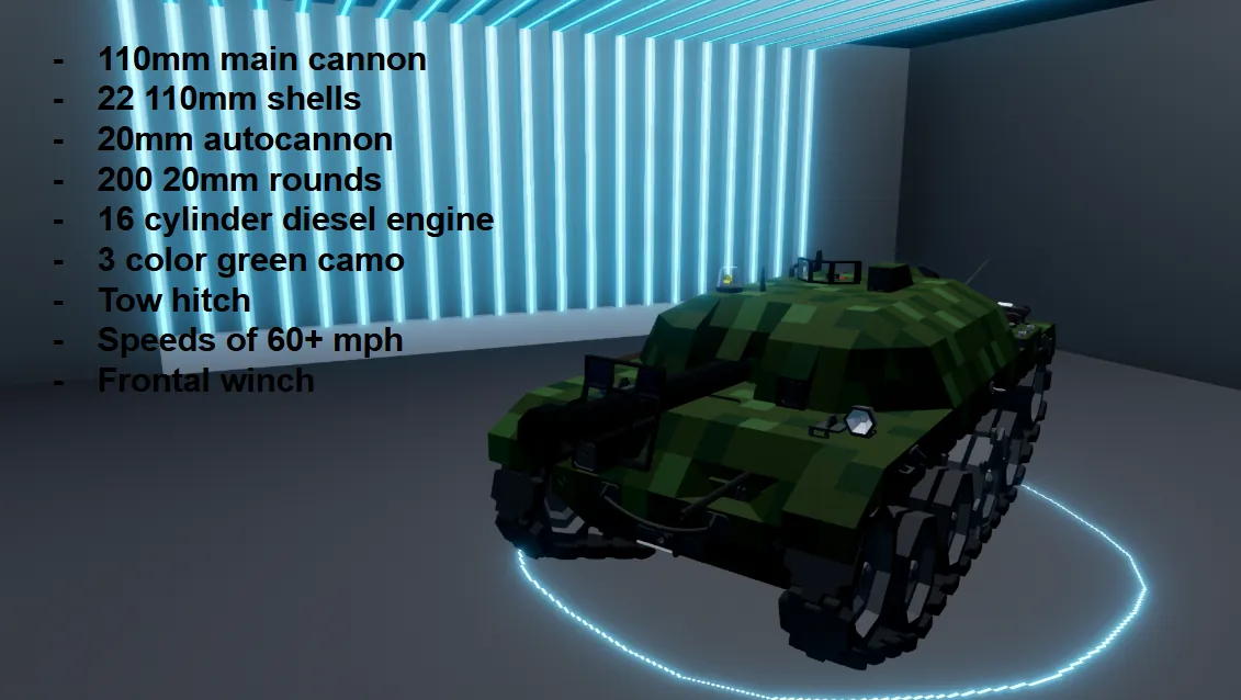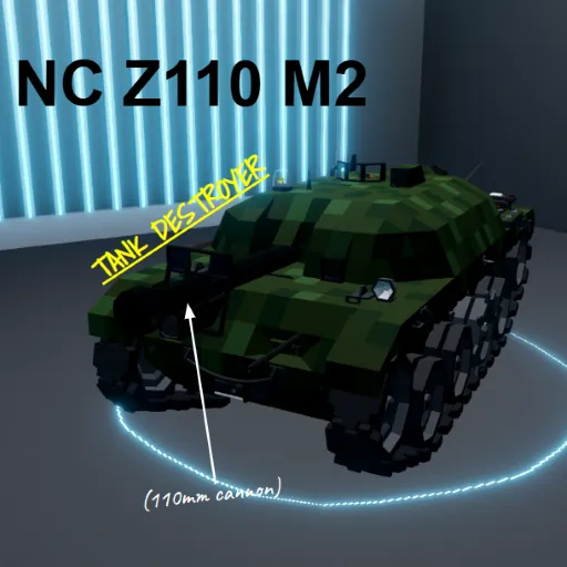 The NC Z110 M2 is a lightly armored casemate tank destroyer. It has a full crew of three or four, but two soldiers can operate it just fine. It sports a 110mm (battle cannon) main gun and a 20mm (light autocannon) hull gun.