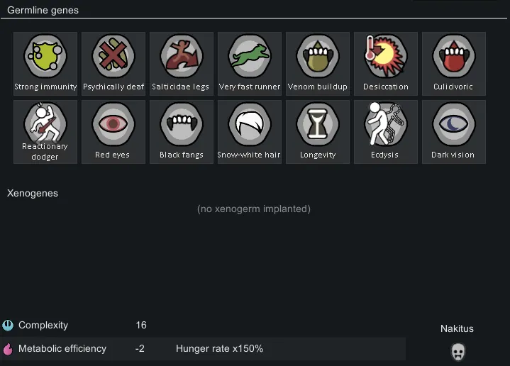 In this scenario you will spawn with a special Nakitus who cranks up the negatives and positives of the Xenotype. With a fat seventy percent chance to dodge all attacks, but an even worse fourteen day venom injection timer that can *only* be used on humans! It's very gimmicky and challenging, but fun!