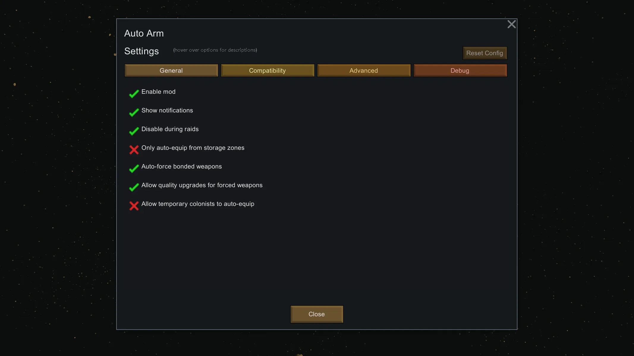 The mod is built for long saves and large colonies. Weapon searches are cached heavily, work is throttled, and the idle overhead is close to zero when no upgrades are pending. In typical play with 10 to 20 colonists the cost is just a tiny fraction of a tick.