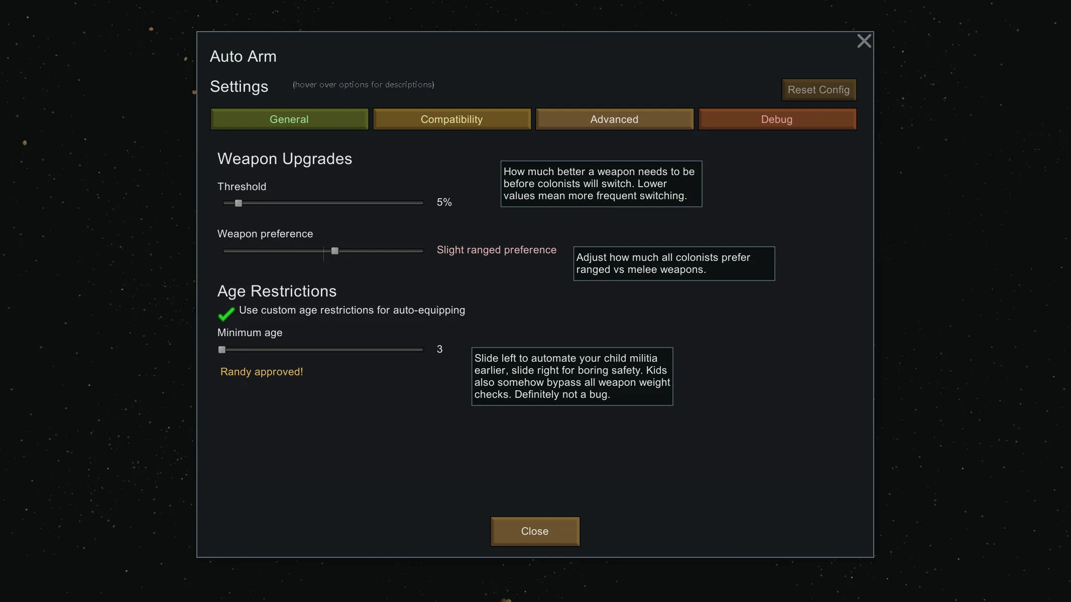 Designed to feel like vanilla. No new tabs, no complex menus, just automatic weapon management that respects outfits, ideology restrictions, traits, skills and upgrades sensibly. Brawlers get melee, shooters grab guns. Smart selection that won't trade assault rifles for wood logs. Set weapons in your Apparel Policy and colonists auto equip weapons from that. Right click equip any weapon to force it and pause automation.