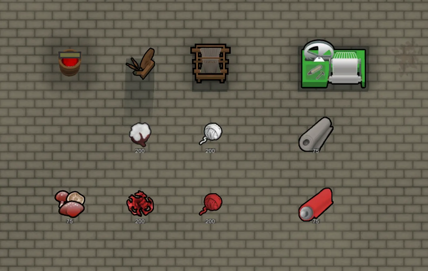 Pre-industrial colonies must build a spinning wheel and loom to spin raw fibres into yarn and then weave it into cloth. This two-stage process is slow. (Pre-[i]furniture[/i] tribal colonies can spin and weave by hand at the crafting spot, but it's even slower.)