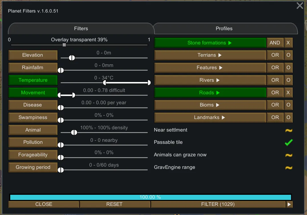 Planet filtering works asynchronously, preventing the game from freezing while searching and displaying a progress bar.