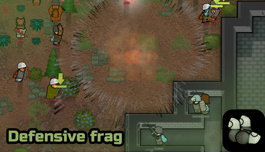 This grenade is designed to be an explosive version of shotgun beanbag shells. It causes bruises and muscle spasms but will lack accuracy against dispersed targets. Useful to capture prisoners or put down unruly colonists.