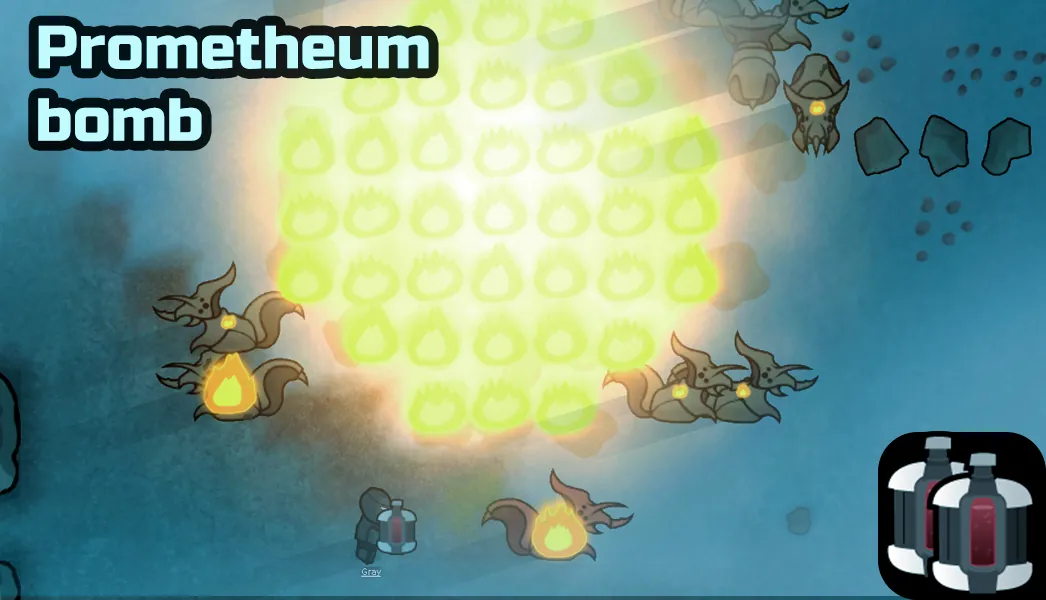 This bomb is a much stronger version of the Molotov cocktail, possessing a wider area of effect and a more powerful explosion. However, it costs a lot of Prometheum and Steel and is very heavy.