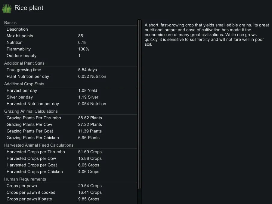 This mod adds a few new useful bits of information for every plant in rimworld, this information includes: