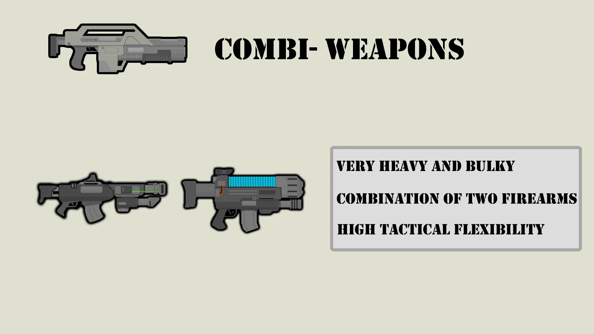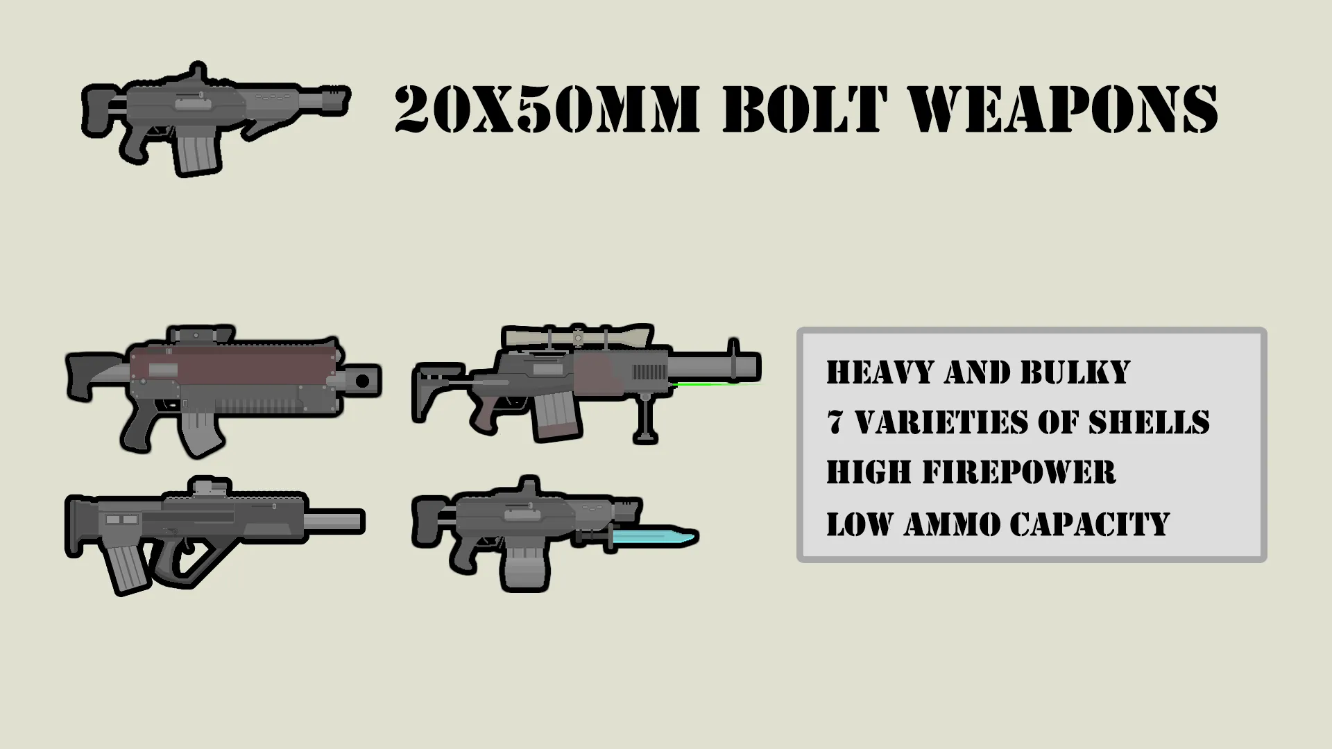 CE Only, Adds a bolt firearm that fires a very heavy, large but powerful 20x50mm rocket-propelled shell and 18x50mm shell.