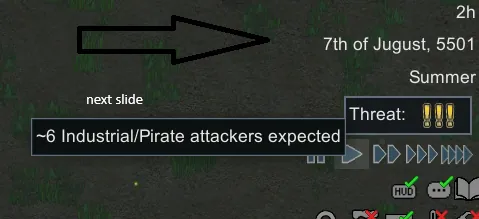 This mod adds a little window around the time controls that shows a number of "!" 's to help visualise the increasing threat raiders pose!