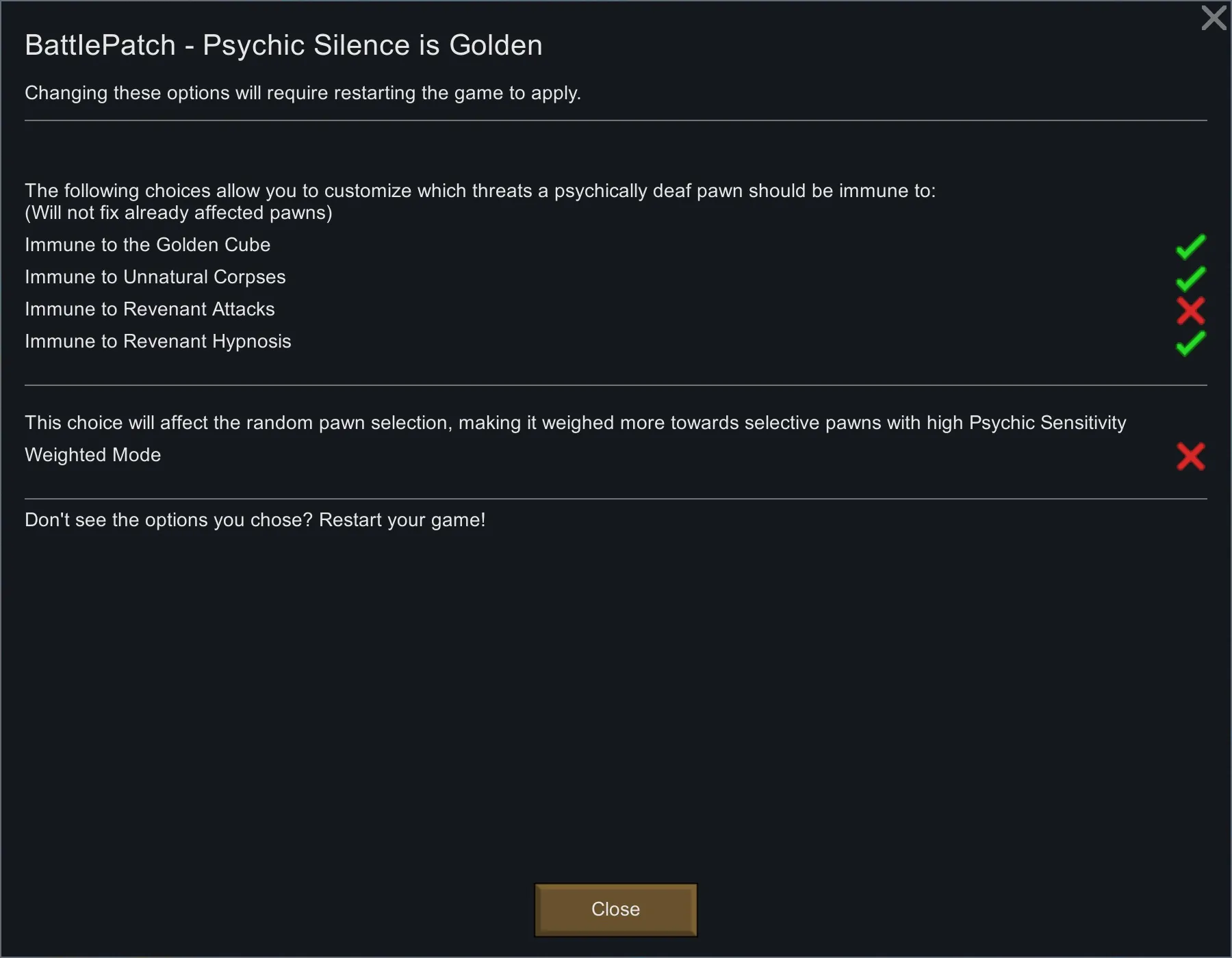 This mod integrates Psychically Deaf pawns a bit better in the Anomaly DLC by making them immune to the Golden Cube's fascination and immune to being targeted by the Unnatural Corpse. There is a choice to have Psychically Deaf pawns be ignored by Revenants, or have them still be targeted by the Revenant but have the Hypnosis not affect them.
